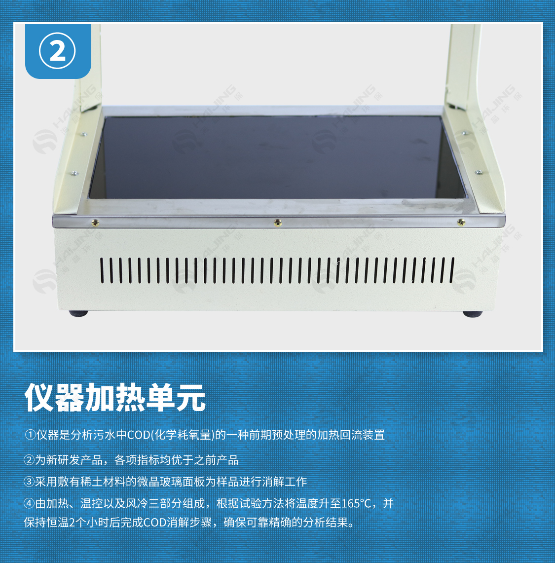 該儀器是分析污水中COD(化學耗氧量)的一種前期預處理的加熱回流裝置;為我廠新研發產品,各項指標均優于之前產品。采用敷有稀土材料的微晶玻璃面板為樣品進行消解工作;由加熱、溫控以及風冷三部分構成,根據實驗方法將溫度升至165℃,并保持恒溫2個小時后完成COD消解步驟。