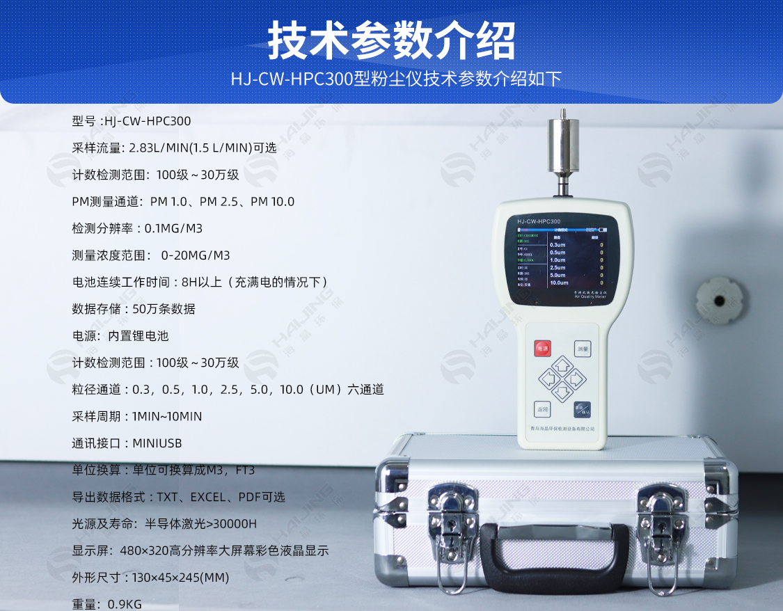 HJ-CW-HPC300 手持式激光粉塵儀用于對(duì)空氣中懸浮顆粒物的濃度進(jìn)行監(jiān)測(cè),采用光散射原理,檢測(cè)速度快,輕便小巧,方便手持操作。采用三通道(PM 1.0、PM 2.5、PM 10.0)同時(shí)測(cè)量并顯示結(jié)果,該方法符合衛(wèi)生部wst206-2001《公共場(chǎng)所中可吸入顆粒物(PM10)測(cè)定方法——光散射法》,符合JJF1190-2008《塵埃粒子計(jì)數(shù)器校準(zhǔn)規(guī)范》,符合國(guó)家計(jì)量技術(shù)規(guī)范JJF1716-2018。