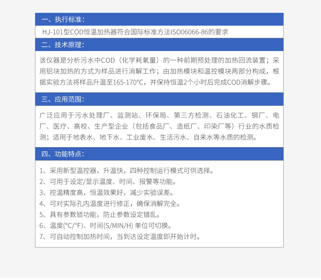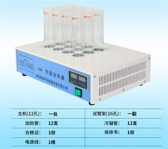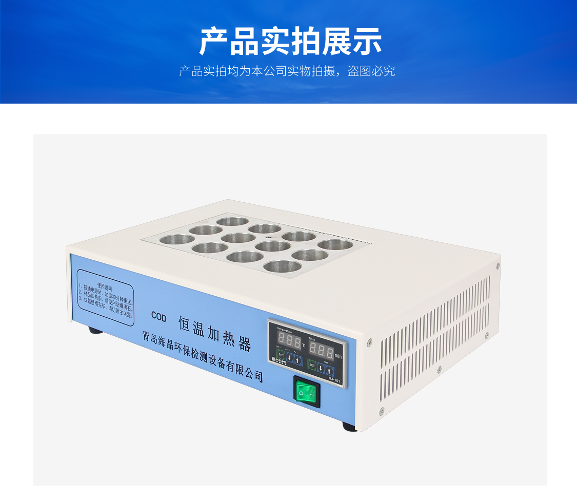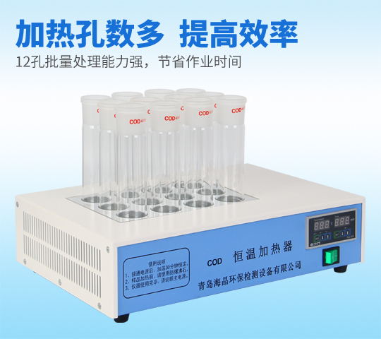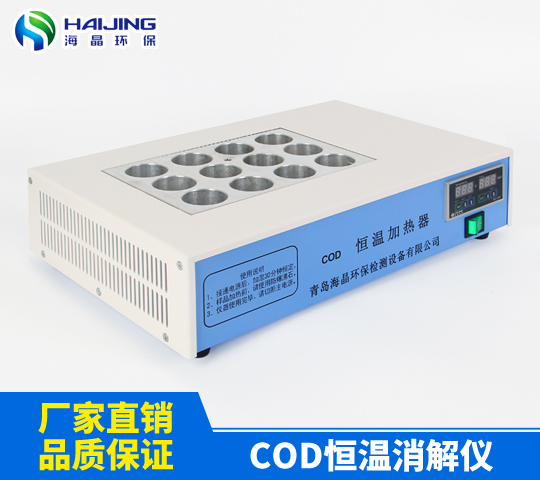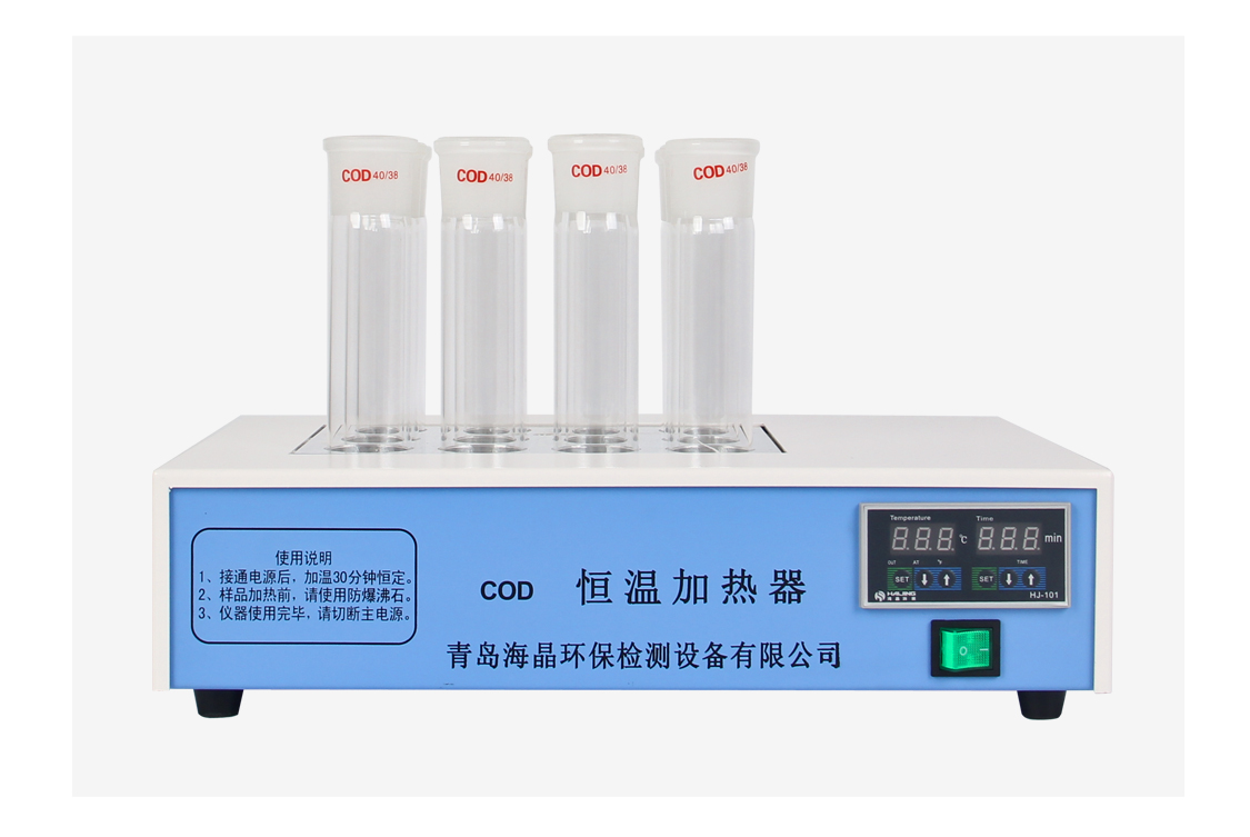 該儀器是分析污水中COD(化學耗氧量)的一種前期預處理的加熱回流裝置;采用鋁塊加熱的方式為樣品進行消解工作;由加熱模塊和溫控模塊兩部分構成,根據實驗方法將樣品升溫至165-170℃,并保持恒溫2個小時后完成COD消解步驟。
