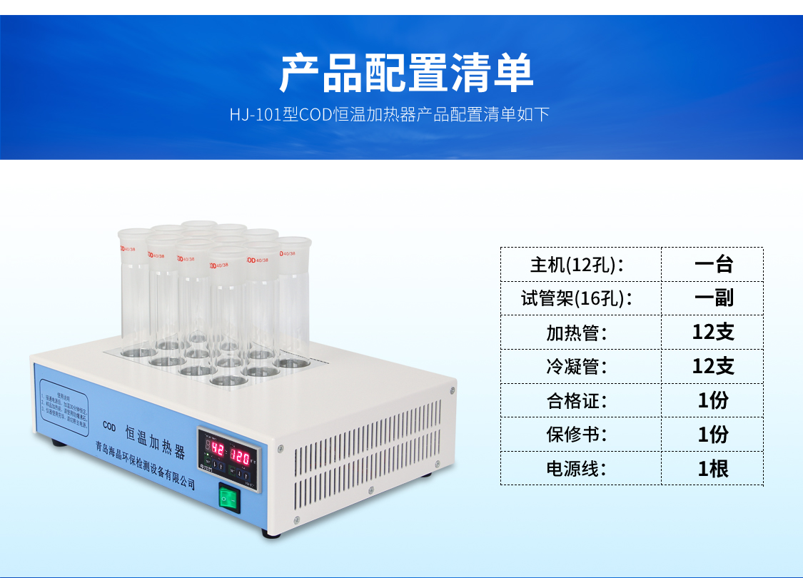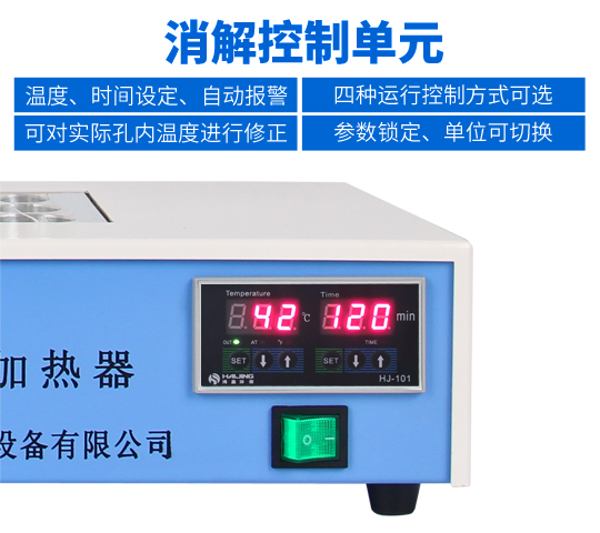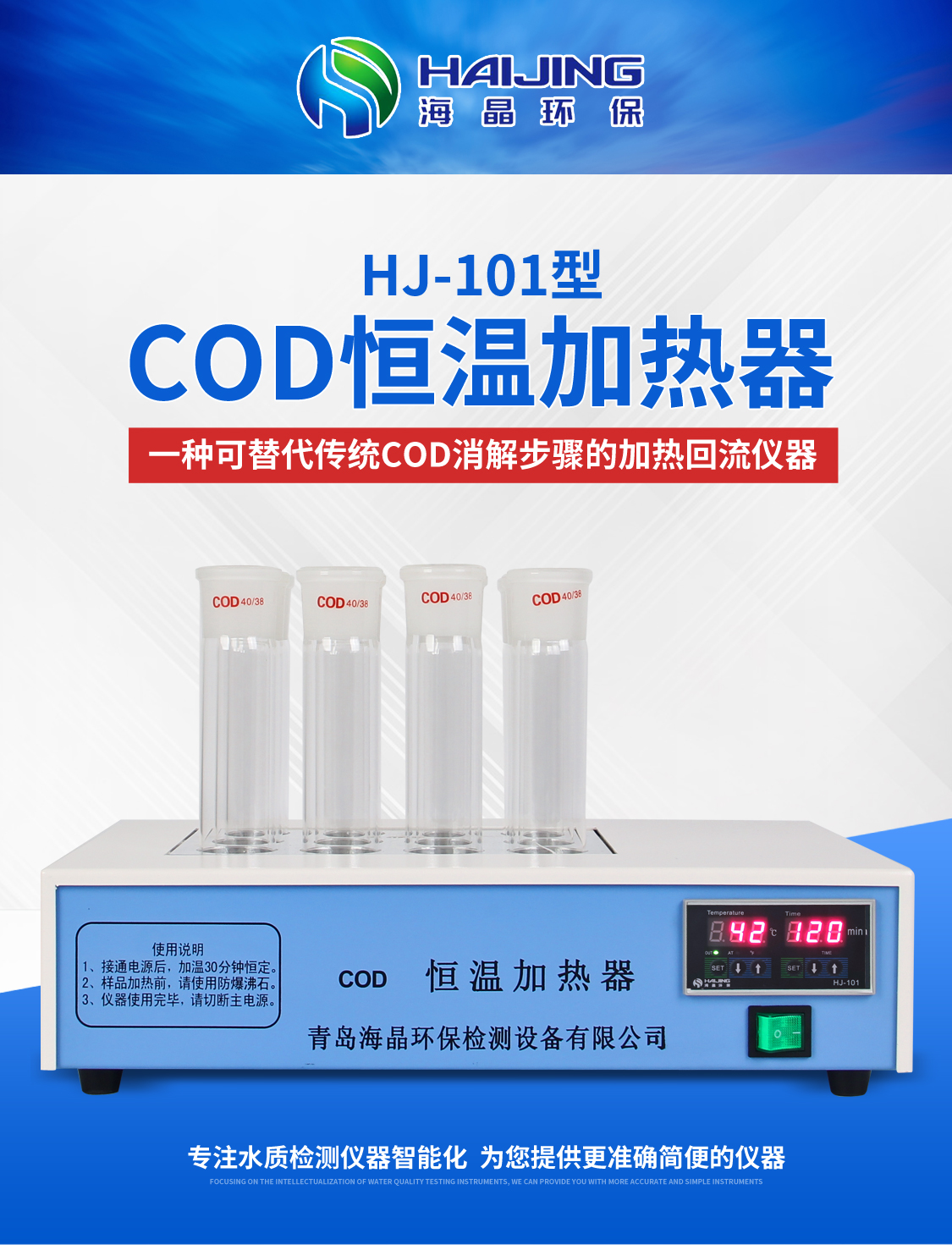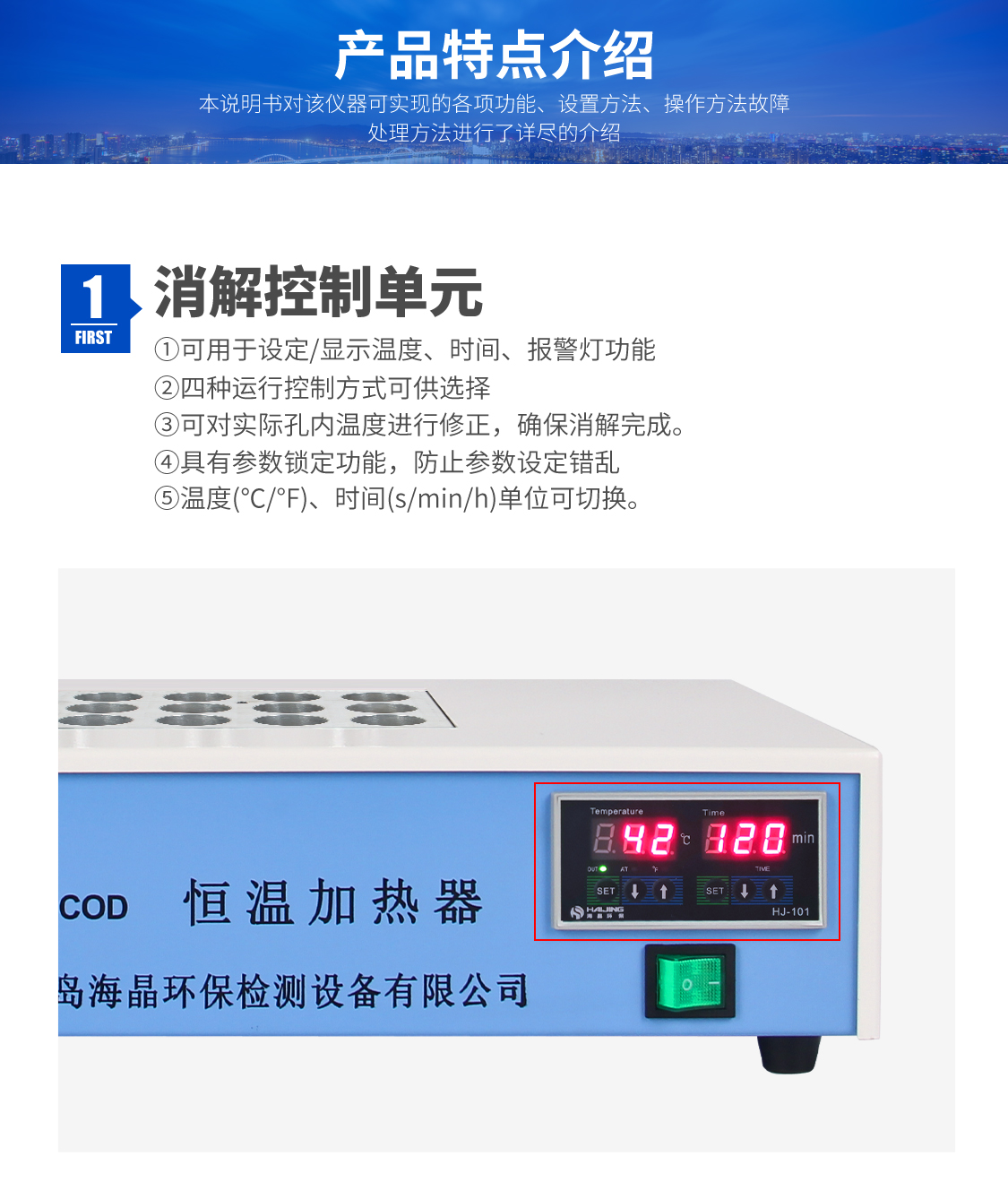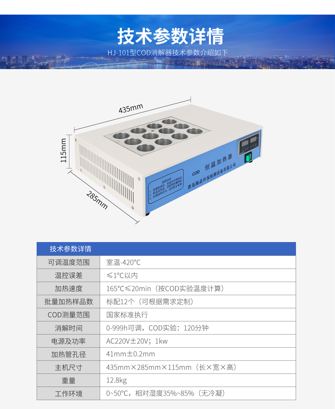 該儀器是分析污水中COD(化學耗氧量)的一種前期預處理的加熱回流裝置;采用鋁塊加熱的方式為樣品進行消解工作;由加熱模塊和溫控模塊兩部分構成,根據實驗方法將樣品升溫至165-170℃,并保持恒溫2個小時后完成COD消解步驟。