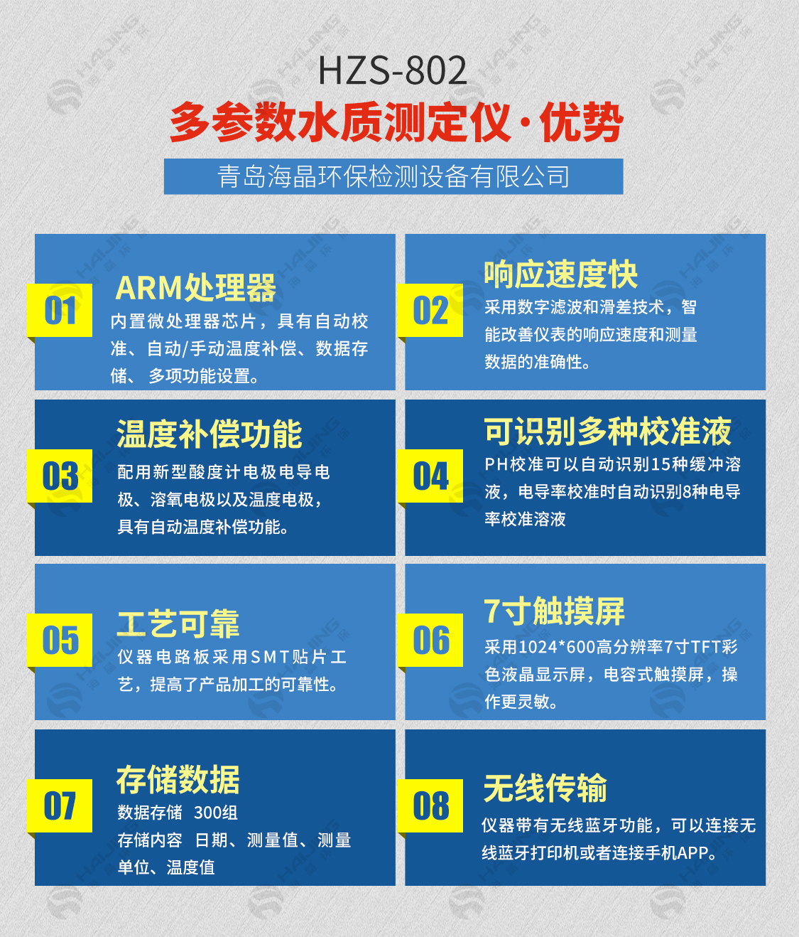 HZS-802型精密pH/mV/電導率/溶解氧多參數測定儀 一、儀器用途: 用于實驗室高精度測量的多參數測量儀,涵蓋pH、電導率和溶解氧等多種電化學參數。適用于石油、化工、醫藥、電廠和環保等行
