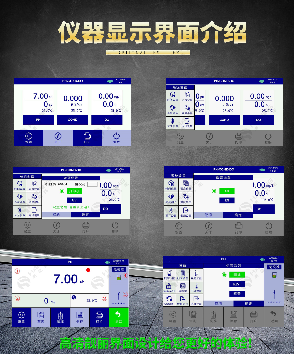 ● 自動識別8種電導率標準溶液,有二個系列的標準溶液可以選擇:歐美系列和中國系列。