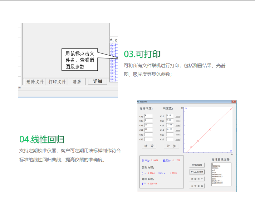 8.軟件功能強大,測量數據及譜圖可以保存到硬盤,隨時可以查詢、打印譜圖,并具有自動調零、回歸方程計算等功能。